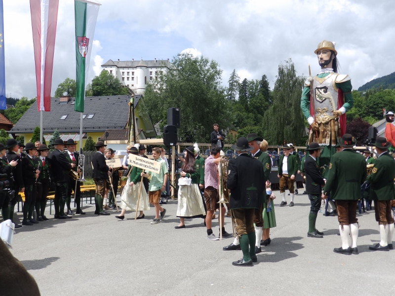 Besonders schön und traurig zugleich war heuer die Riadl-Trage. Sie trägt stets die Muttergottesstatue und ist daher bereits ein Blickfang, heuer jedoch war sie außerdem mit Trauerflor geschmückt, da am Tag zuvor unsere liebe Riadl-Mutter Maria Würger verstorben ist. Maria war immer Feuer und Flamme wenn es um Fronleichnam, dem Blumen brocken, Trage binden, schön verzieren, in die Kirche tragen und dem Präsentieren beim Umzug ging, deshalb war es etwas sehr Berührendes, dass sie in ihrem Sinne und mit den Gedanken bei ihr getragen wurde. Wir denken fest an die Hinterbliebenen und wünschen viel Kraft für diese schwere Zeit.