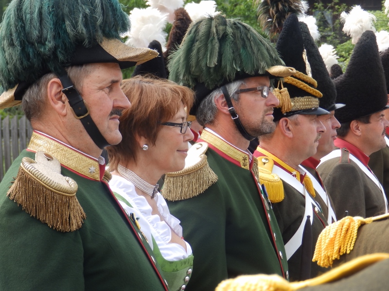 Danach marschierten wir zur Kirche, wo wir das Schützenamt umrahmten. Nach einem schnellen Mittagessen beim Stigenwirth und einer Getränkestärkung am Stand der Schützen unter der Kirche bereiteten wir uns auf den Umzug vor. Mit ca. 200 Anwesenden insgesamt zogen wir von Station zu Station, wobei das Wetter wirklich gut mitspielte.